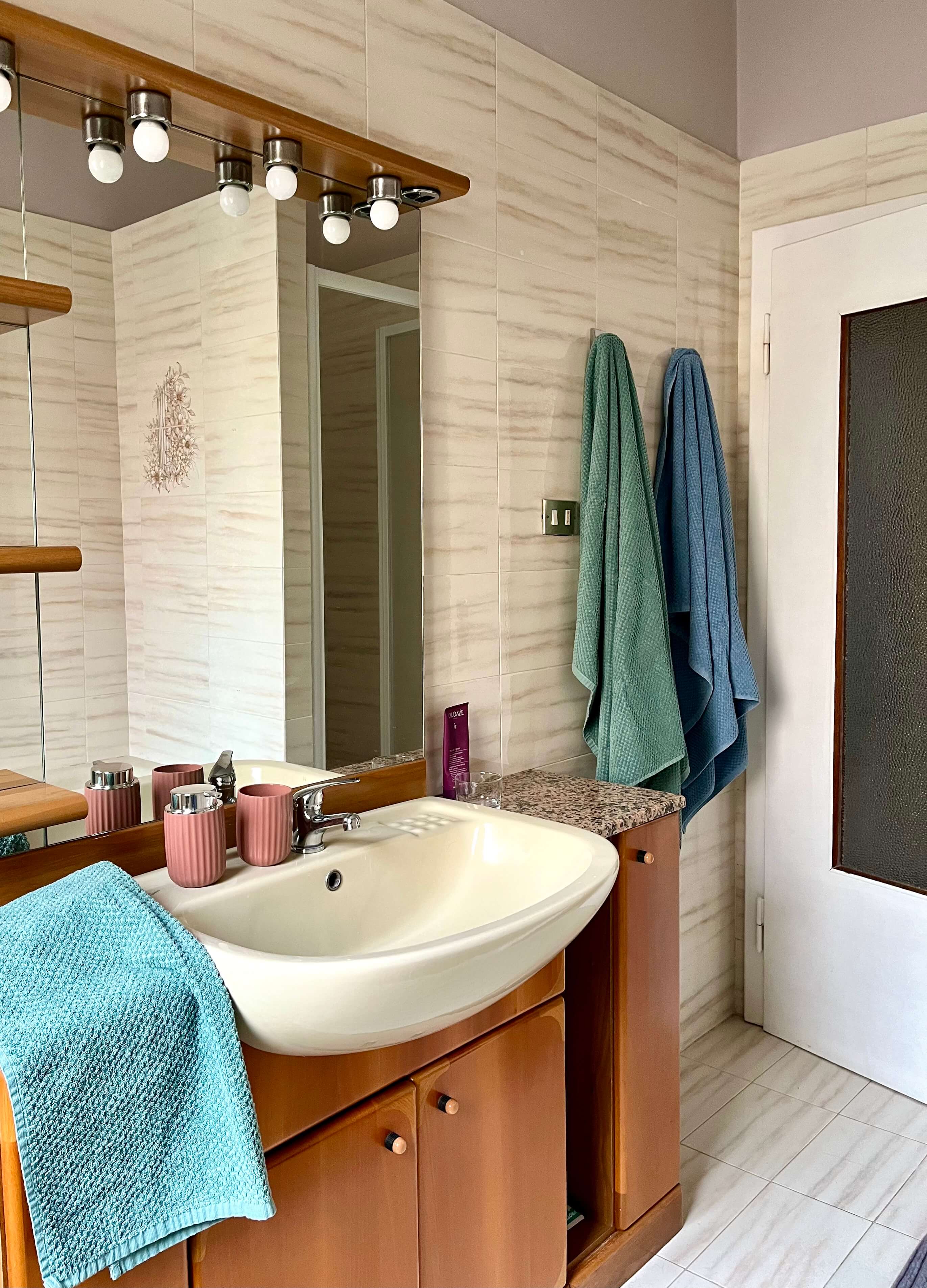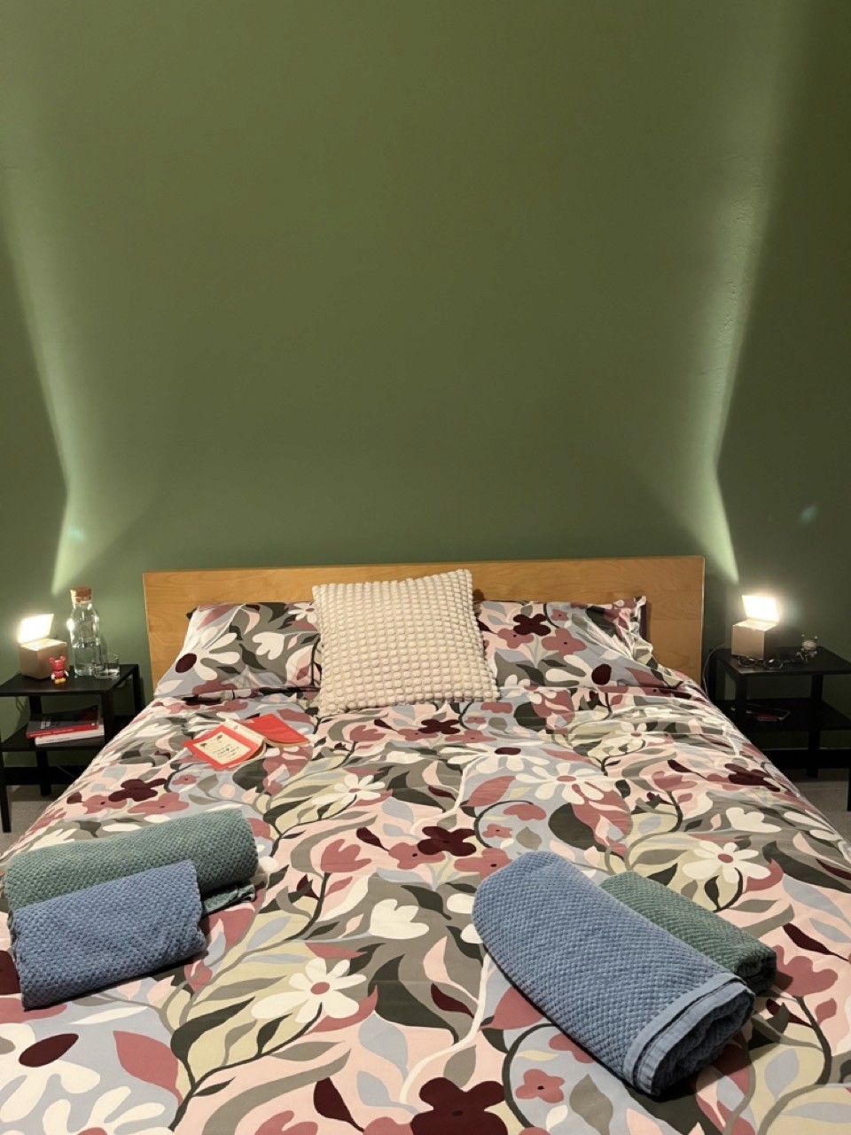 A cozy and stylish double bedroom featuring a comfortable double bed with duvet and colorful bed linen, bedside tables with designer lamps, and an open industrial-style wardrobe. Soft curtains ensure privacy and a relaxing atmosphere. Perfect for families, the room can accommodate a third bed and a crib suitable for children up to 3 years old, making it a welcoming space for parents traveling with little ones.